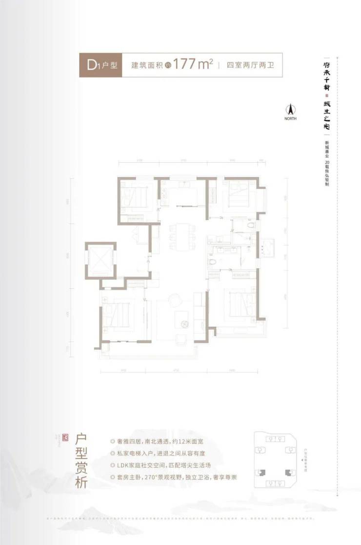 177平四室两厅两卫,仍旧是四叶草格局,南向大阳台很抢眼,客厅面宽4.75米,主卧还设有270度转角飘窗,总价大概在1097万。