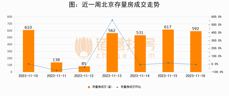 从存量房来看,2023年11月16日北京存量房单日成交592套,比昨日减少25套,环比下降4%。从近一周存量房成交来看,北京存量房日均成交套数为447套,11月16日单日成交592套,高于近一周平均水平32.4%。
