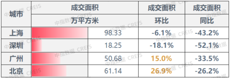 9月,根据中指研究院的数据,一线城市成交面积整体同比持续下降,降幅为38.32%;但环比小幅回升,环比小幅上涨4.17%。