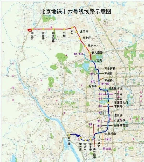 16号线途经丰台、西城、海淀3个行政区,整条线路南边始发站是宛平站,经过北京丽泽金融商务区、西城三里河、国家图书馆、苏州街、永丰科技园区、海淀山后地区,北至海淀区北安河。