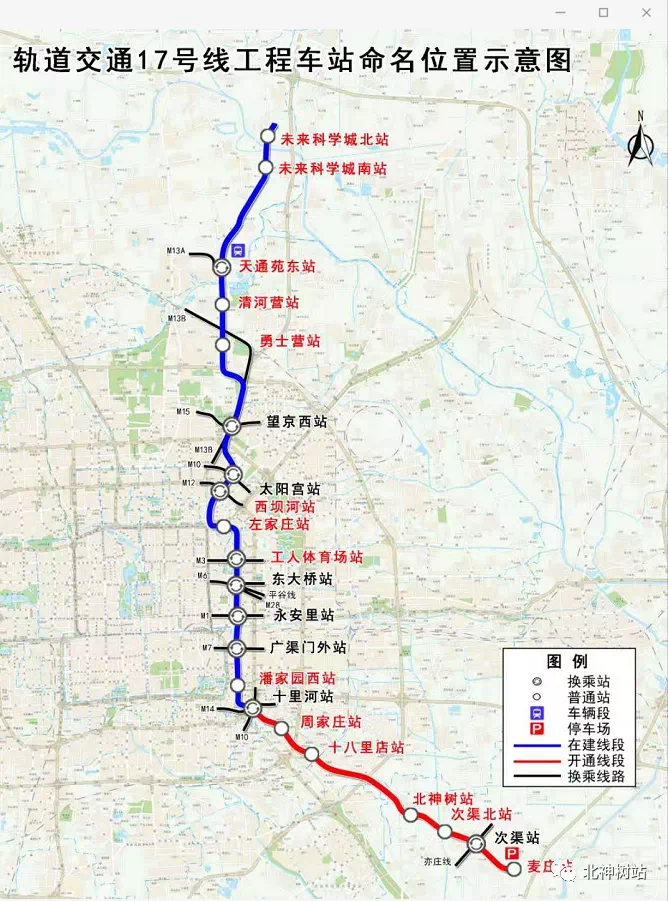 北京地铁17号线是一条贯穿中心城南北方向的交通干线,呈现“L”形走向,北起昌平区未来科学城北区站,途经朝阳区、东城区,南至亦庄站前区南站,南北贯穿北京中心城区。