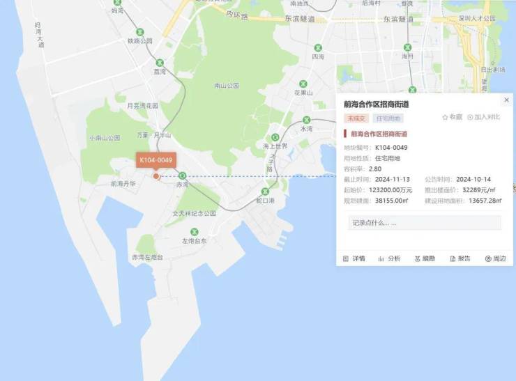 出让文件显示,地块位于赤湾片区赤湾六路与天后宫路交会处以东,出让面积13657平方米,规划建筑面积38155平方米,起始总价为12.32亿元。