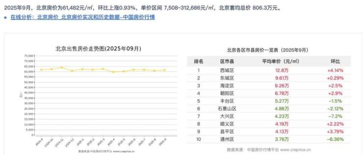 根据中国房价行情平台,2025年9月北京平均房价为61482元/㎡,环比上涨0.93%;但平均房租却降至100.59元/月/㎡,环比下降5.26%。
