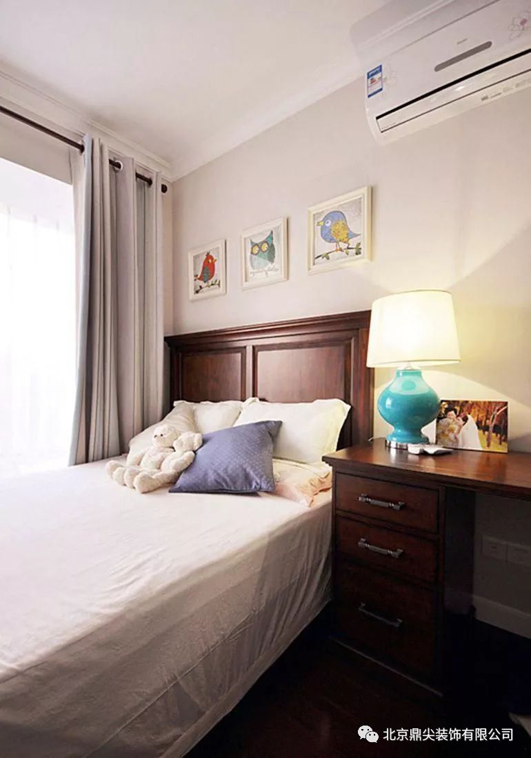▲ 次卧,深棕色的床与浅色的床头背景墙有一个强烈的视觉对比。