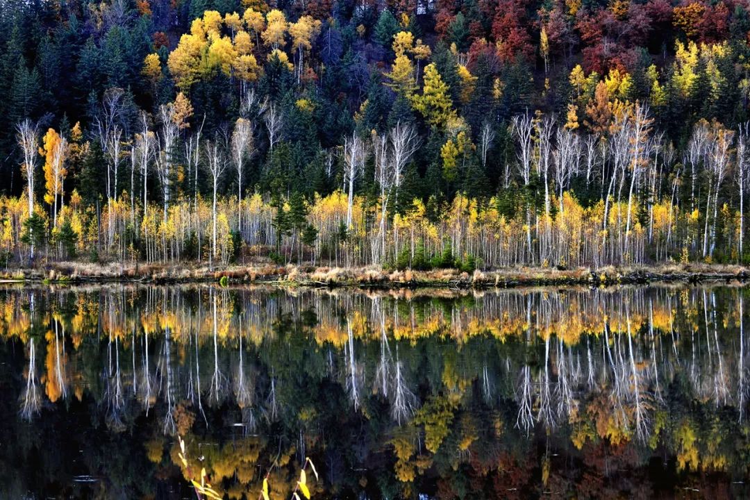 深秋时节,樟松的绿,枫叶的红,桦树的白,柞树的褐和落叶松的金黄把小兴安岭装扮得五彩缤纷,就像一枝自然“神笔”作就的绚烂水彩画。