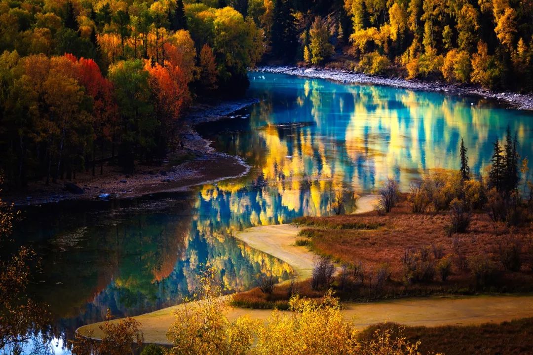 秋天的喀纳斯河,宛如一条翠绿色玉带,披挂在阿尔泰山的秋天里。“喀纳斯”是蒙古语,意为“美丽而神秘的湖”。喀纳斯湖雪峰耸峙绿坡墨林,湖光山色美不胜收,被誉为“人间仙境,神的花园”。