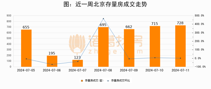 从存量房来看,2024年07月11日北京存量房单日成交728套,比昨日增加13套,环比上涨1.8%。从近一周存量房成交来看,北京存量房日均成交套数为539套,07月11日单日成交728套,高于近一周平均水平35.1%。
