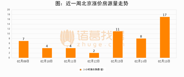 根据诸葛找房数据显示,北京24小时涨价房源量为17套,较02月14日增加9套,环比上涨112.5%。与此同时,涨价房源占比小幅扩大,业主信心有所提升。