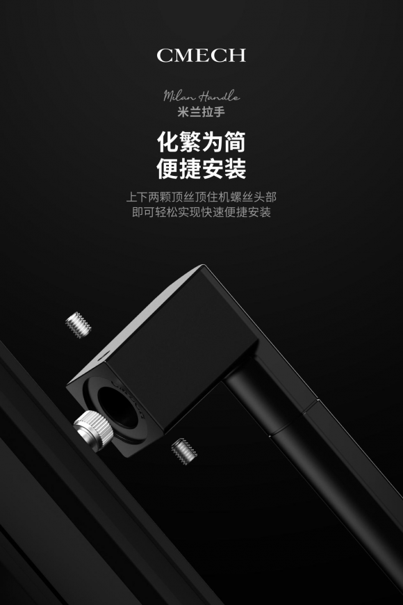 除去性能品质,门窗五金的安装也是极为关键的一个环节。CMECH希美克的米兰拉手为让安装和调整更加简单便捷,将结构设计化繁为简,相较于市场上其他同类产品,上下两颗顶丝顶住机螺丝头部,即可实现快速便捷安装。
