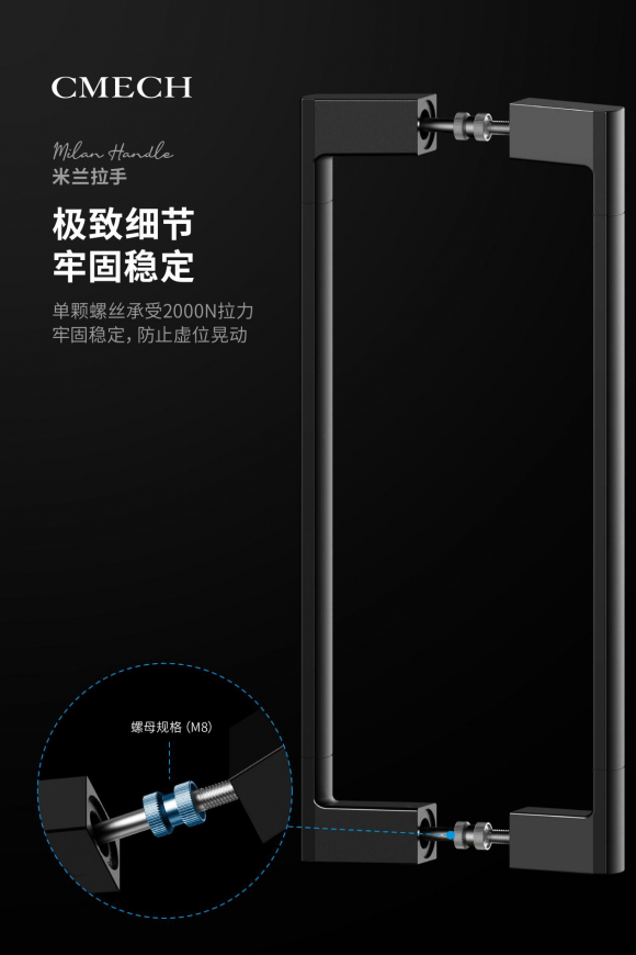 门窗五金作为门窗的心脏,其性能必须是极为优秀的,否则将会让门窗存在无数的威胁隐患。在性能设计上,CMECH希美克的米兰拉手使用了不锈钢螺栓、螺母,其中螺母规格(M8)比市场同类产品(M6)大了一个等级,且单颗螺丝能承受2000N拉力,非常的牢固稳定。