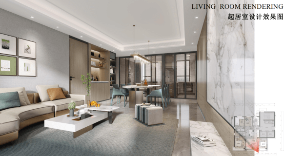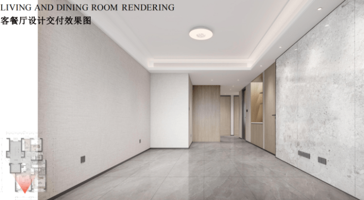 以87平米户型为例,客厅地面采用大尺寸仿石砖,品质感更高级,墙面带壁纸交付,居住上更显品质。卫生间屋顶则是采用防水石膏板吊顶+防水乳胶漆,整体性强、密封性能好,更加美观、兼具品质感。