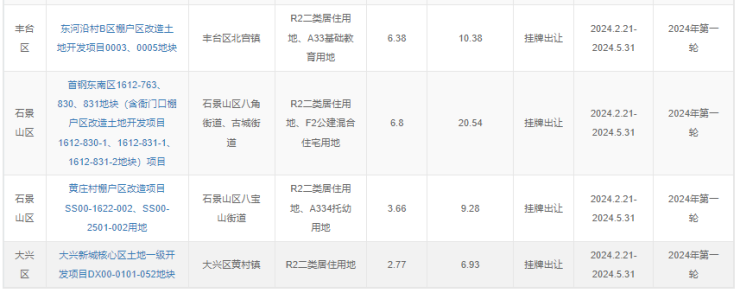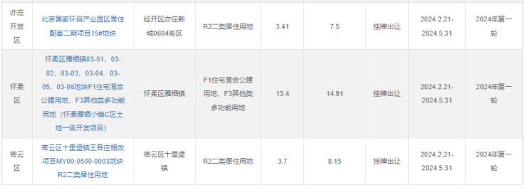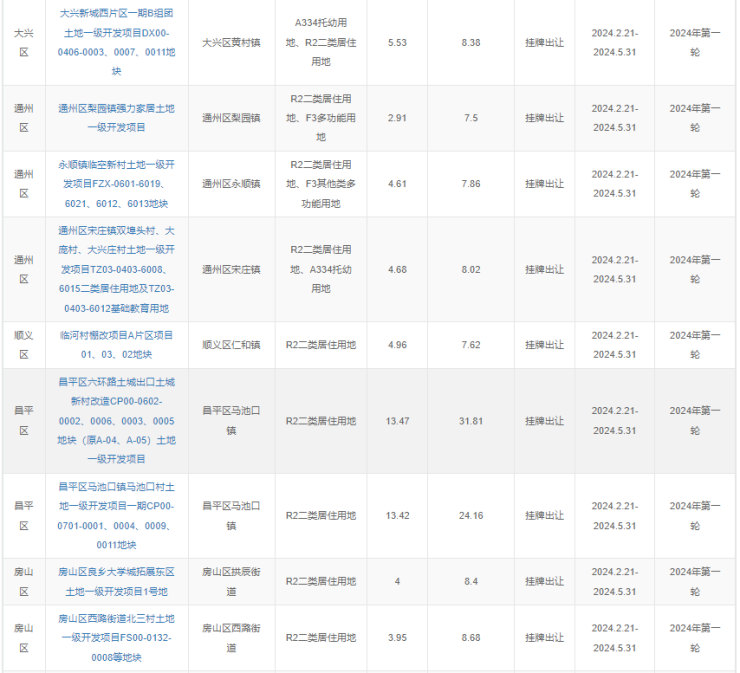此外,通州区推出3宗宅地;石景山、大兴区、昌平区、房山区、亦庄均分别推出2宗宅地;丰台区、怀柔区、密云区、顺义区各计划推出1宗宅地。