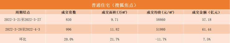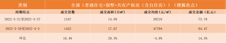 上周(3月28日-4月3日),新房市场各项成交数据均持续环比上涨,成交套数、成交面积以及成交金额均保持增长,但因低价项目于上周进行集中签约,成交均价有所下调。