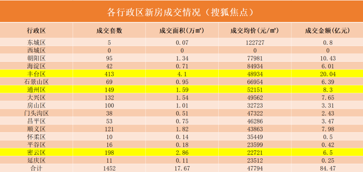 在新房区域成交金额排行中,丰台区则以20.04亿的成交金额稳居排名前列。整体而言,排名前三的分别为丰台区、朝阳区、通州区,分别为20.04亿、10.43亿、8.3亿。