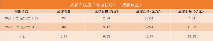 共有产权房(含自住房)市场上周(3月28日-4月3日)上扬幅度较小,但整体上仍表现出平稳上升趋势,发展势头向好。成交套数由338套上涨到361套,环比上升6.8%;而成交金额由7.61亿元升至11.82亿元,环比上升55.3%。