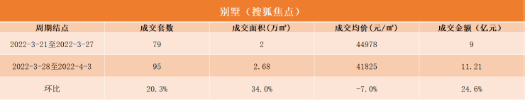 别墅市场于三月末四月初(3月28日-4月3日)的总体成交数据仍然保持良好的上涨趋势,但较比之前的趋势,上周成交的上升幅度趋缓。成交套数从79套环比上涨20.3%升至95套;成交金额也从9亿元环比增长24.6%至11.21亿元。