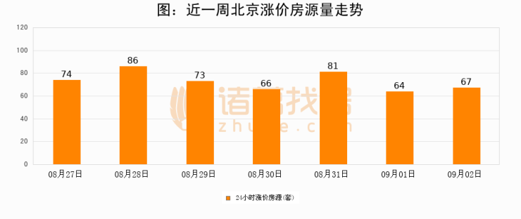 根据诸葛找房数据显示,北京24小时涨价房源量为67套,较09月01日增加3套,环比上涨4.7%。与此同时,涨价房源占比小幅扩大,业主信心有所提升。