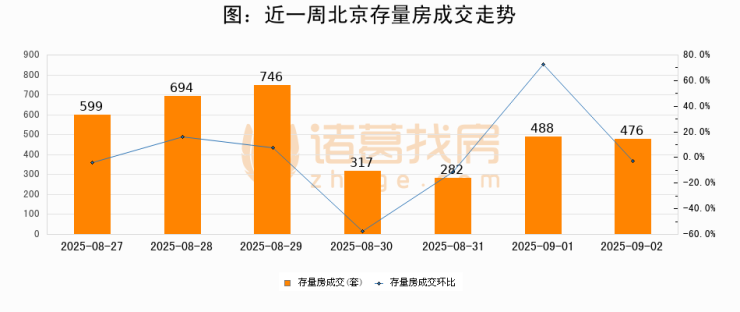 从存量房来看,2025年09月02日北京存量房单日成交476套,比昨日减少12套,环比下降2.5%。从近一周存量房成交来看,北京存量房日均成交套数为514套,09月02日单日成交476套,低于近一周平均水平7.4%。