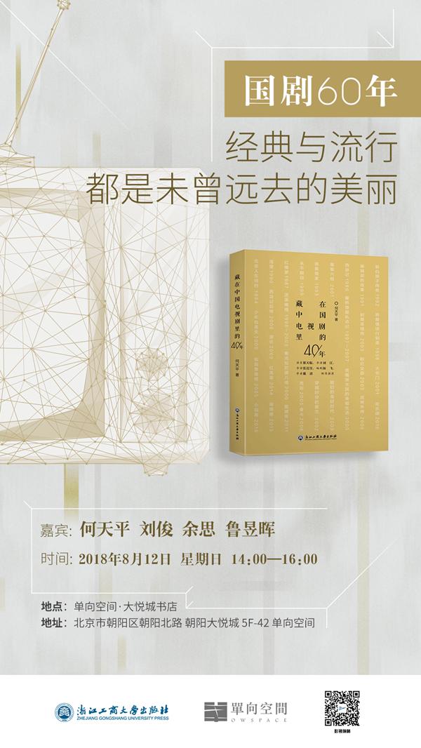 1958年,标记了中国电视许多个“排名前列次”,中国电视事业从这里发轫,“电视的一代”在一方荧光屏的滋养下茁壮成长。到今天,刚好60年。8月12日,文化作家、电视研究学者何天平携其新书《藏在中国电视剧里的40年》做客单向空间·大悦城书店,与读者聊聊他的国剧情结。主办方还邀请到著名学者刘俊、CAA签约编剧余思、青年编剧鲁昱晖一同畅聊电视剧文化,为读者答疑解惑。