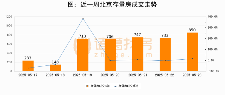 从存量房来看,2025年05月23日北京存量房单日成交850套,比昨日增加117套,环比上涨16%。从近一周存量房成交来看,北京存量房日均成交套数为590套,05月23日单日成交850套,高于近一周平均水平44.1%。