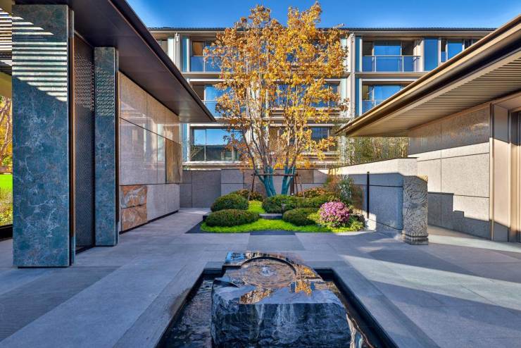 主入口大门对望香山,以“九五规制”打造,尽显大气磅礴。自然石景与瀑布景墙相互呼应,宛如西山层峦的微缩景观,九重归家礼序,让归家之路充满了仪式感。