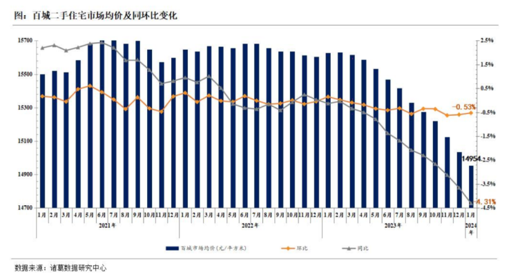 价格方面,根据诸葛数据研究中心显示,1月100个重点城市二手住宅市场均价环比下降0.53%,同比下降4.31%。