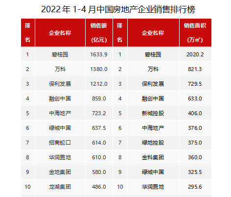 碧桂园、万科、保利发展1-4月销售额超千亿