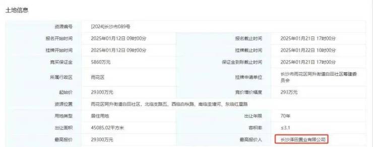 1月22日,位于湖南省长沙市雨花区经开板块的[2024]长沙市089号纯宅地挂牌截止,最终由长沙泽田置业有限公司以底价2.93亿元摘得,折合楼面价为2096元/平方米。这也是2025年长沙市出让的首宗纯住宅用地。