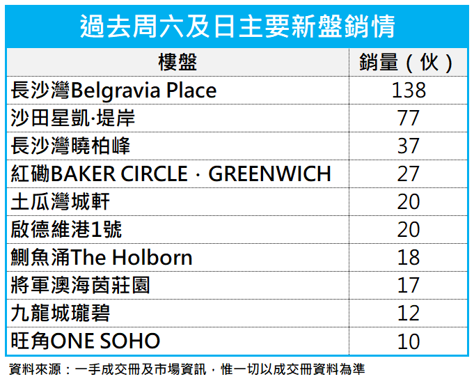 新盘市场方面,在刚刚过去的周末中,共有40个新盘录得成交。其中,“撤辣”后首个全新盘、恒基兆业地产集团旗下的“长沙湾Belgravia Place”成绩最为显著。该盘于3月3日展开首轮销售后,共138 个单位获得约4330票的认购,超额逾30倍。