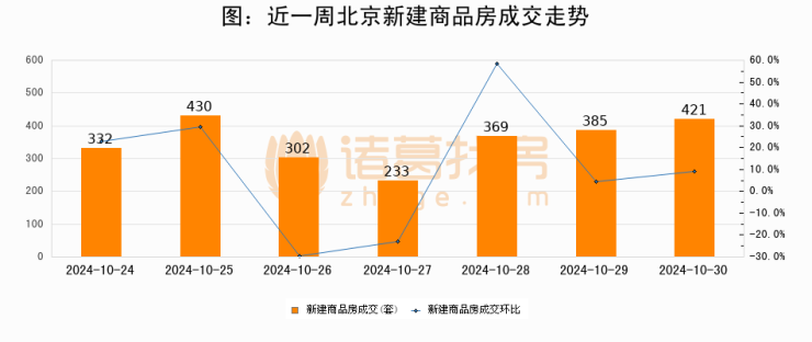 根据北京市住房和城乡建设委员会数据显示,2024年10月30日北京新建商品房成交421套,较昨日增加36套,环比上涨9.3%