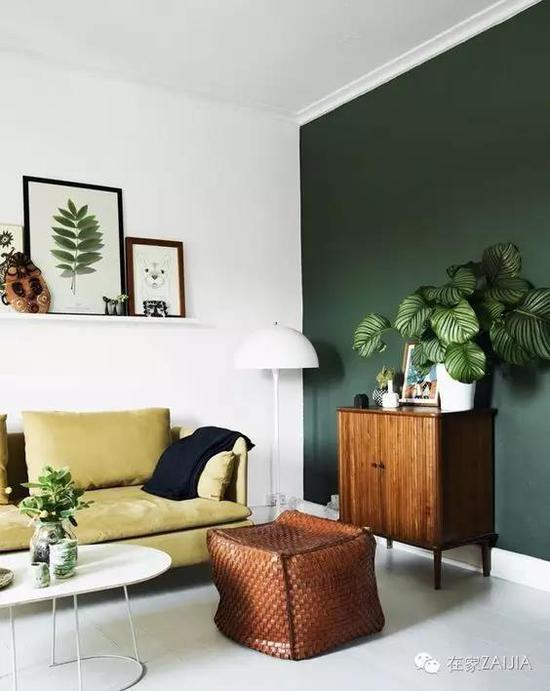 可能很多小伙伴都不敢尝试四面墙上色,咱就来一面or半面。Ps:小编很爱青苹果竹芋(下图)、龟背竹这类的植物,跟墨绿色遇到简直就不想拆开啊!