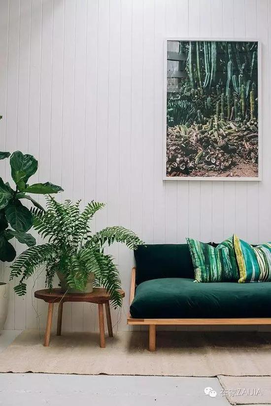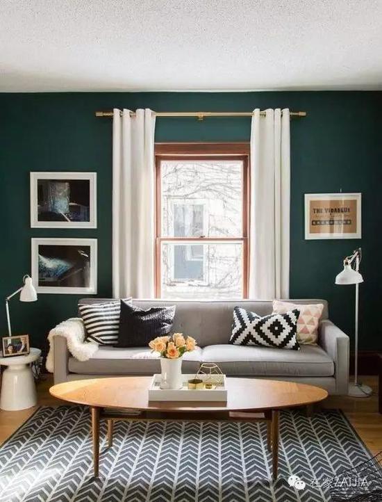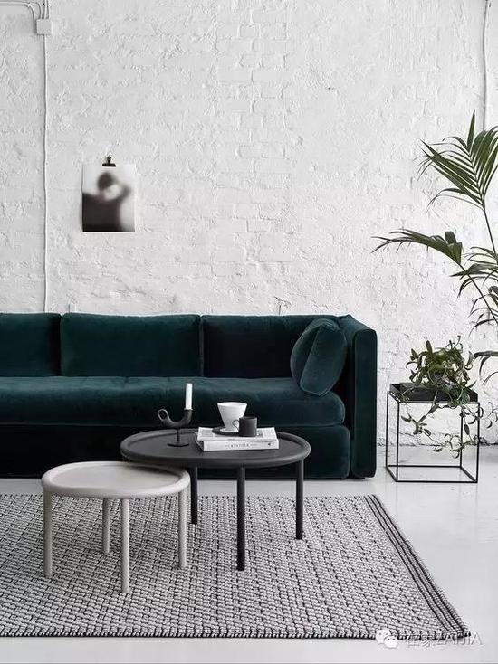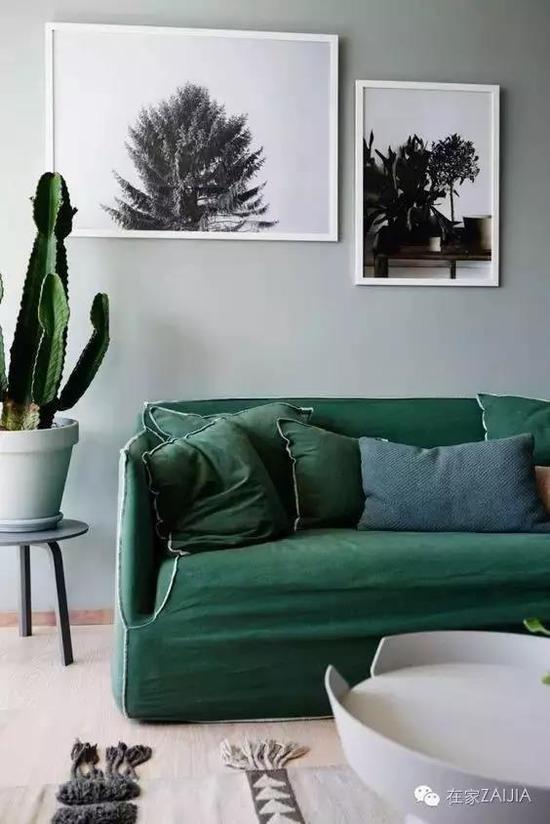 客厅用墨绿,排名前列个能换的物件就是沙发,再来几盆自带墨绿色的植物就更好了。