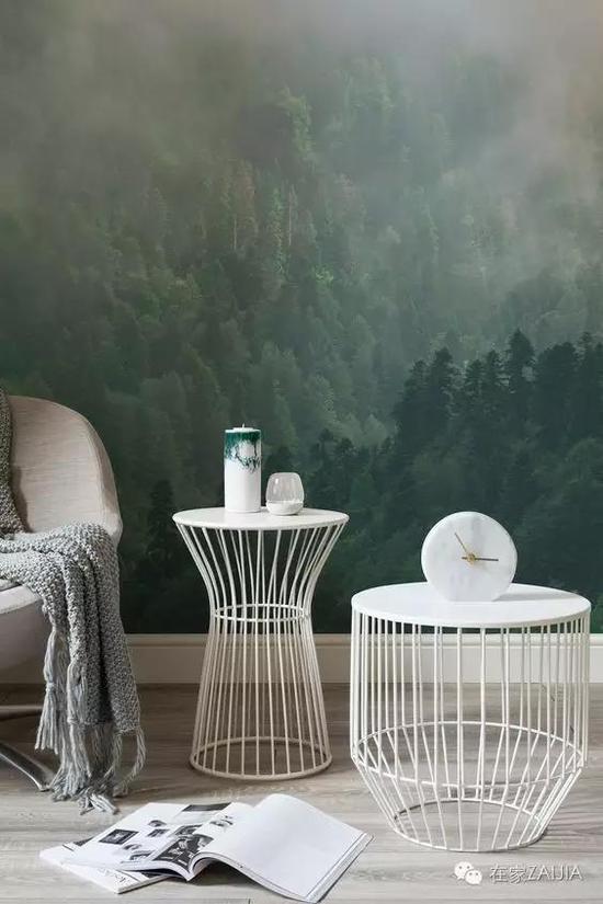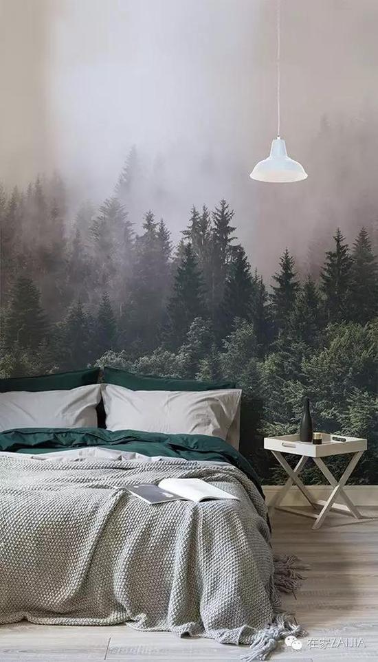 其实除了刷墙面,你还可以这样让墨绿色上墙。本来就是取之自然的颜色,这样自然系的壁纸,让墨绿色的墙面更具层次感。