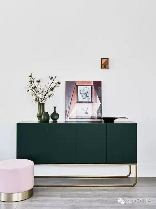 像上面说的,墨绿色是深沉的色彩,所以需要一些明亮的颜色来中和。想要家中有些复古调调,就尝试让墨绿色作为背景色,但在用色的具体比例和搭配色彩上,要十分留神,一不小心就会弄个昏暗空间出来。