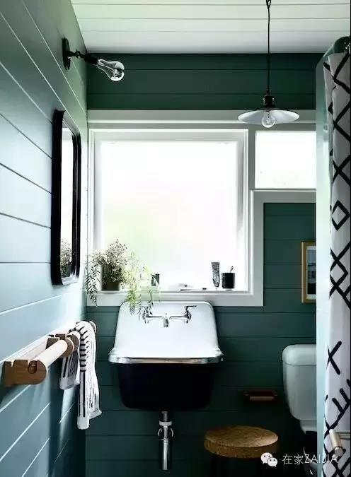 在采光好的浴室墙面搞一搞墨绿色,洗个澡也能有气质。