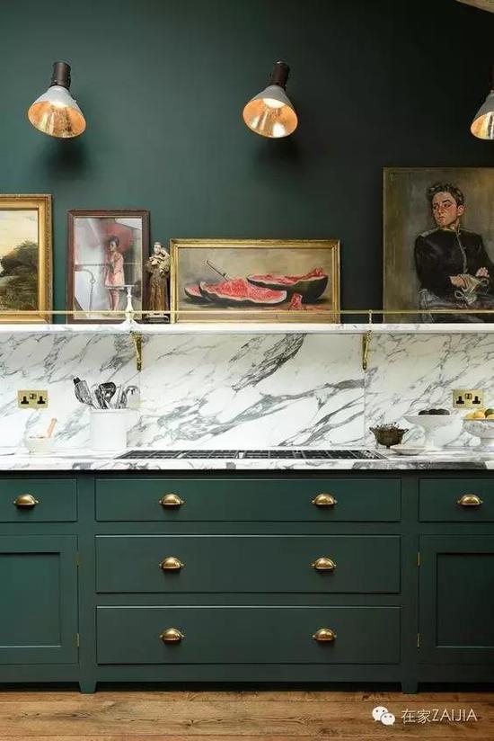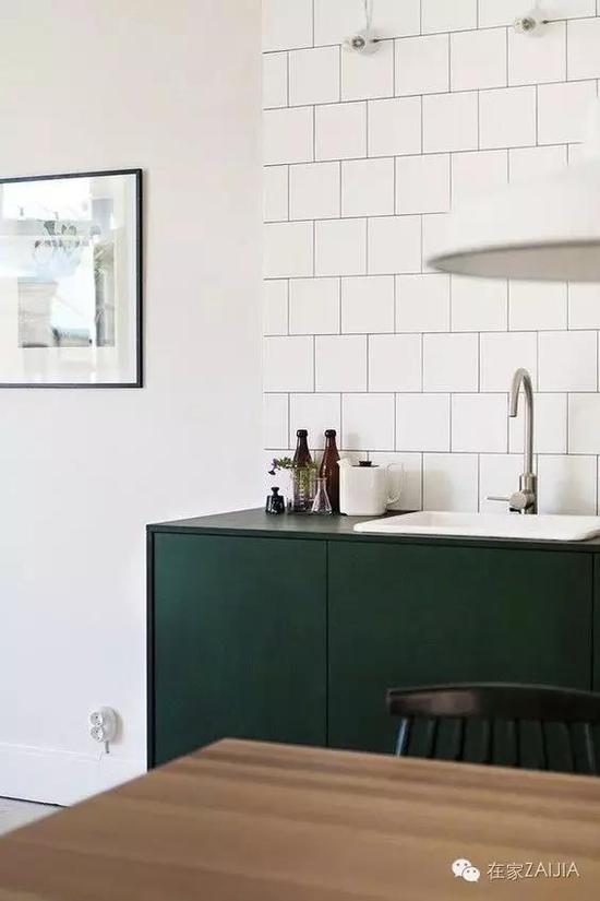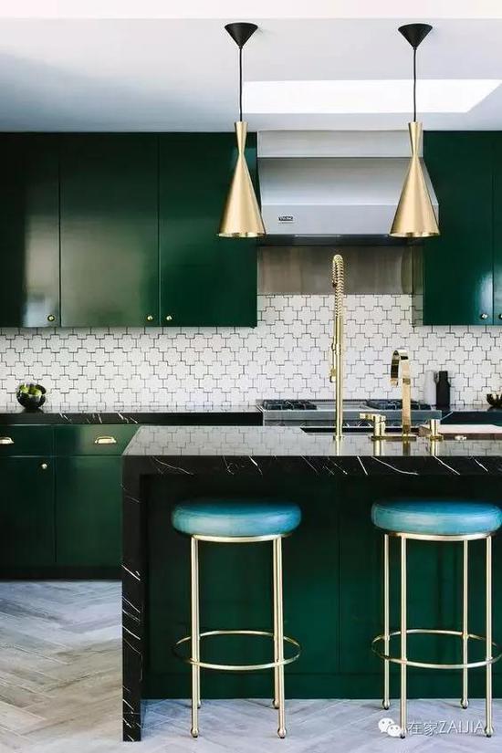 其实橱柜漆上墨绿色,再置备些金属质感灯具和五金件,视觉上色彩饱和度有了,光泽感也有了。当然,别忘了墨绿:白色=1:1。