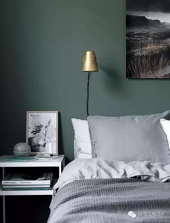墨绿色勾搭上灰色,则会让空间沉稳度+1,为了让空间有亮点,黄铜色床头灯不仅跟墨绿很搭,还能满足复古控的你。