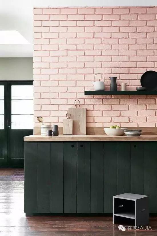 见惯了常规搭配,想走个不寻常路的盆友,粉绿配搭你们可喜欢?较让家居君心动的是小粉砖墙和橱柜的质感都保持一致。