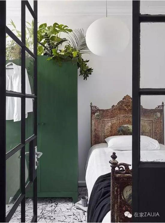 从橱柜、储物柜到衣柜,大白墙配墨绿单品,个性的没的说。