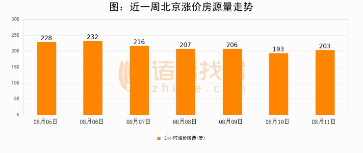 根据诸葛找房数据显示,北京24小时涨价房源量为203套,较08月10日增加10套,环比上涨5.2%。与此同时,涨价房源占比小幅扩大,业主信心有所提升。