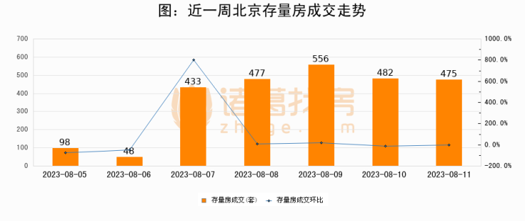 从存量房来看,2023年08月11日北京存量房单日成交475套,比昨日减少7套,环比下降1.5%。从近一周存量房成交来看,北京存量房日均成交套数为367套,08月11日单日成交475套,高于近一周平均水平29.4%。
