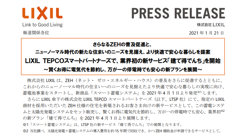 骊住集团1月21日在官网宣布,为促进ZEH(零能耗住宅)的普及和应对新常态下的住居需求,公司将开展蓄电池业务,排名前列款电池产品“智能蓄电系统”将于4月1日推出,关联企业LIXIL TEPCO SMART PARTERS将负责电池产品的营销工作,拟和太阳能发电系统一起打包向客户销售。