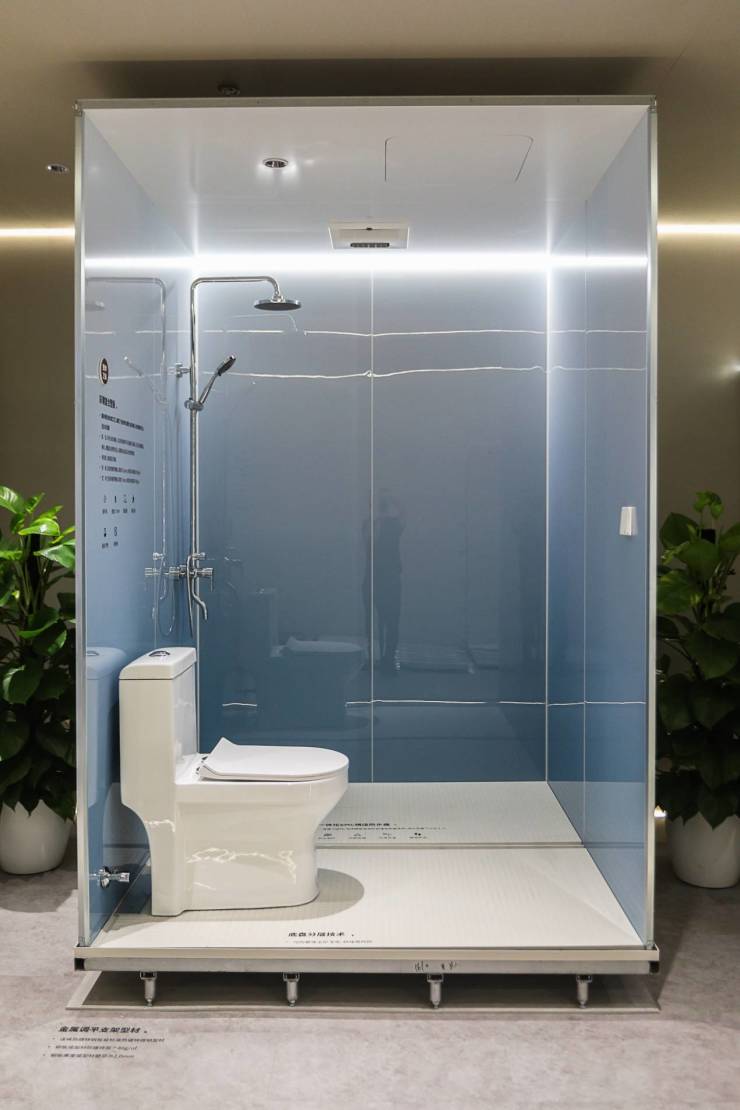 华耐智装展厅内无刺鼻甲醛气味、无刺耳切割轰鸣,更无堆积如山的建筑垃圾,干净整洁的环境与传统装修工地形成鲜明对比。取而代之的,是一面面在工厂预制完成、纹理规整的墙体,一套套设计精巧、可像搭积木般快速组装的整体卫浴。据工作人员介绍,这样一套完整的卫浴,现场安装仅需短短4小时。