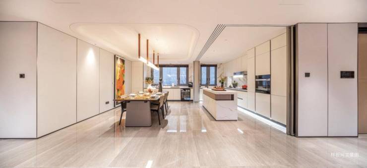在功能布局上,可观景厨房设计,在保障室内空气流通的同时,一边烹饪一边观景。灵动开放式设计,拉通了空间视野,延伸空间的尺度感,这样的设计一方面让空间利用率得到有效的提升。独立餐厅的设计,让餐厅衍变为这个家的第二个重要社交场所,拥有更多的幸福凝聚力,并可以为家的日常创造出更多仪式感。