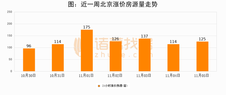 根据诸葛找房数据显示,北京24小时涨价房源量为125套,较11月04日增加11套,环比上涨9.6%。与此同时,涨价房源占比小幅扩大,业主信心有所提升。