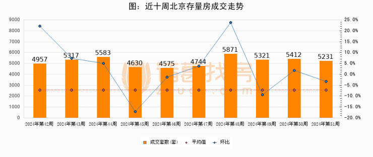 存量房方面,第51周北京存量房成交5231套,较上周减少181套,环比下降3.3%。从近十周成交走势来看,周均成交套数为5164套,本周高于平均水平1.3%。