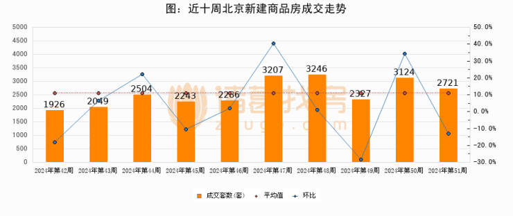 进入2024年第51周(12月16日-12月22日),北京新建商品房成交2721套,较上周减少403套,环比下降12.9%。从近十周成交来看,周均成交套数为2563套,本周成交2721套,高于近十周平均成交量6.2%。