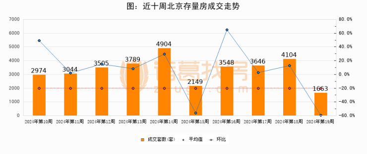 存量房方面,第18周北京存量房成交1663套,较上周减少2441套,环比下降59.5%。从近十周成交走势来看,周均成交套数为3332套,本周低于平均水平50.1%。