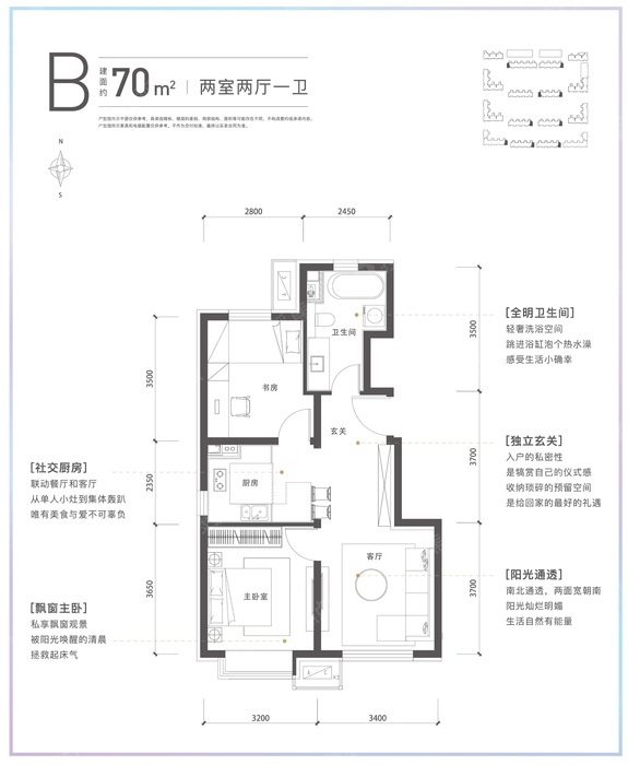 项目目前在售的较小户型就是70平的两居,一居早已售罄。首先房屋的朝向很明显的南北向,而且还是南北通透,两面宽朝南的。主卧带飘窗就不说了,卫生间是明卫,保证了极好的通风和采光,还能放置浴缸,提高生活的质量。入户的玄关,保证更加私密的生活空间。至于价格,两居总价较低只要190万。项目还有81平的两居和89平的三居,也是性价比十分不错的。