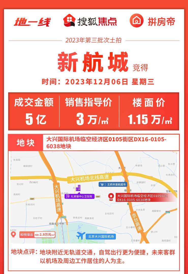 接下来再看看另外一块地,大兴国际机场临空经济区0105街区DX16-0105-6038地块,这宗地在大兴机场附近,附近没有地铁,出行主要靠自驾和公交车。本宗地块仅新航城报名并报价,最终以5亿元底价成交,楼面价约1.15万/㎡,销售指导价3万/㎡。